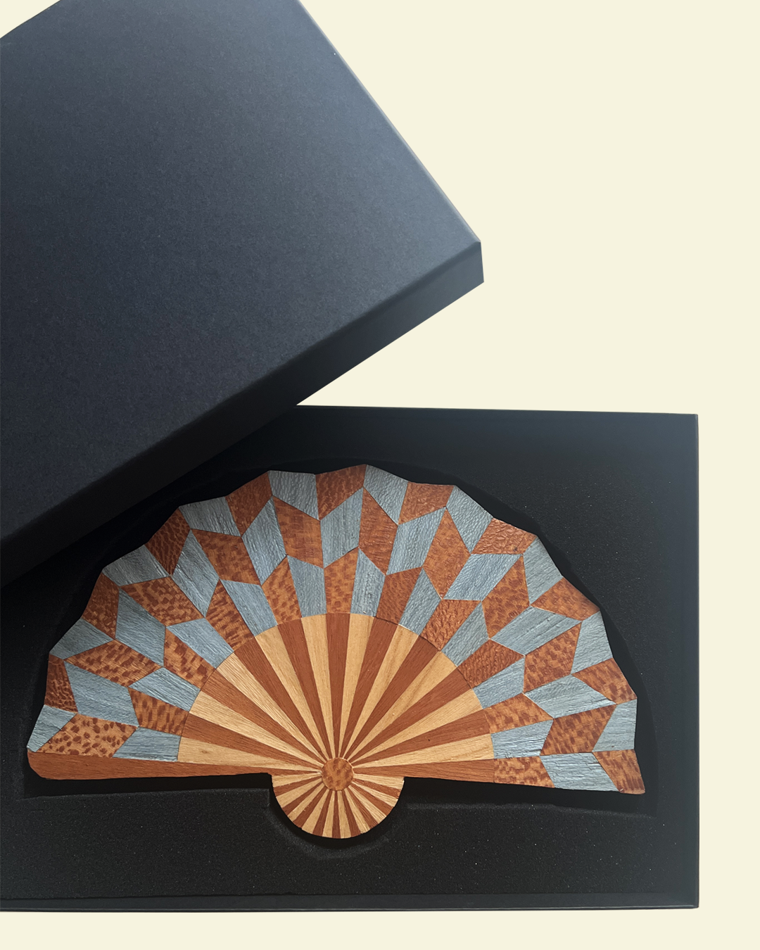 Intricately handcut wood veneer marquetry wall fan using a variety of wood veneer off-cuts. Inspired by traditional quilting patterns as well as Lou's original and striking geometric designs.