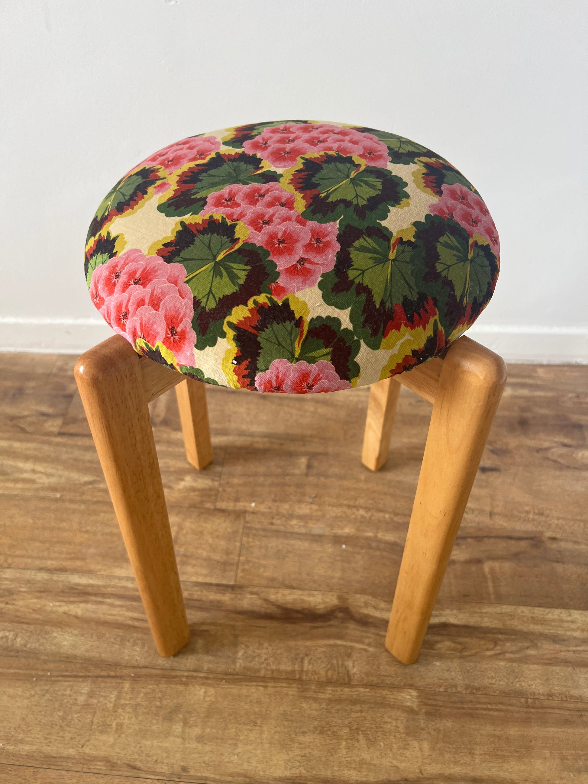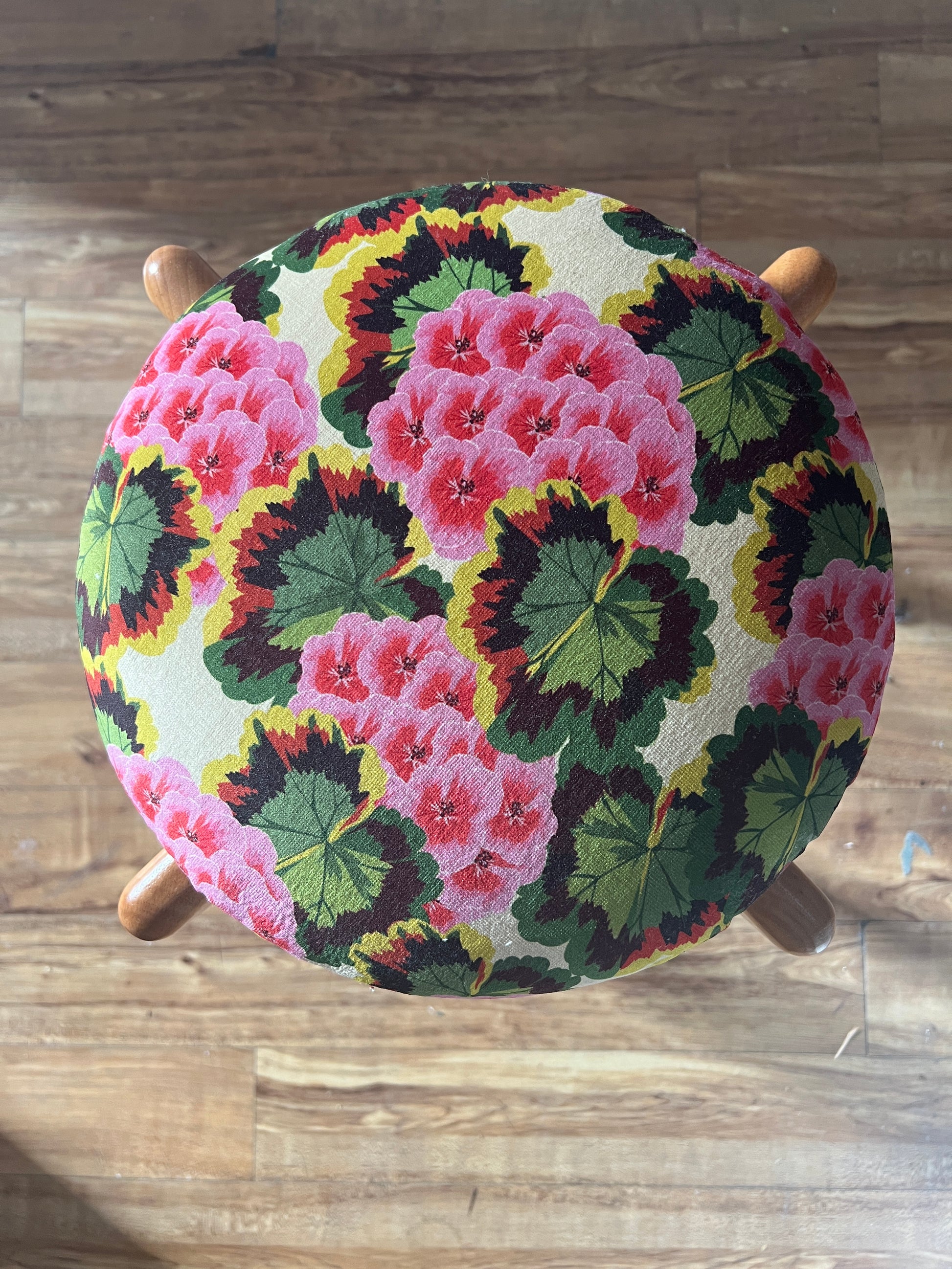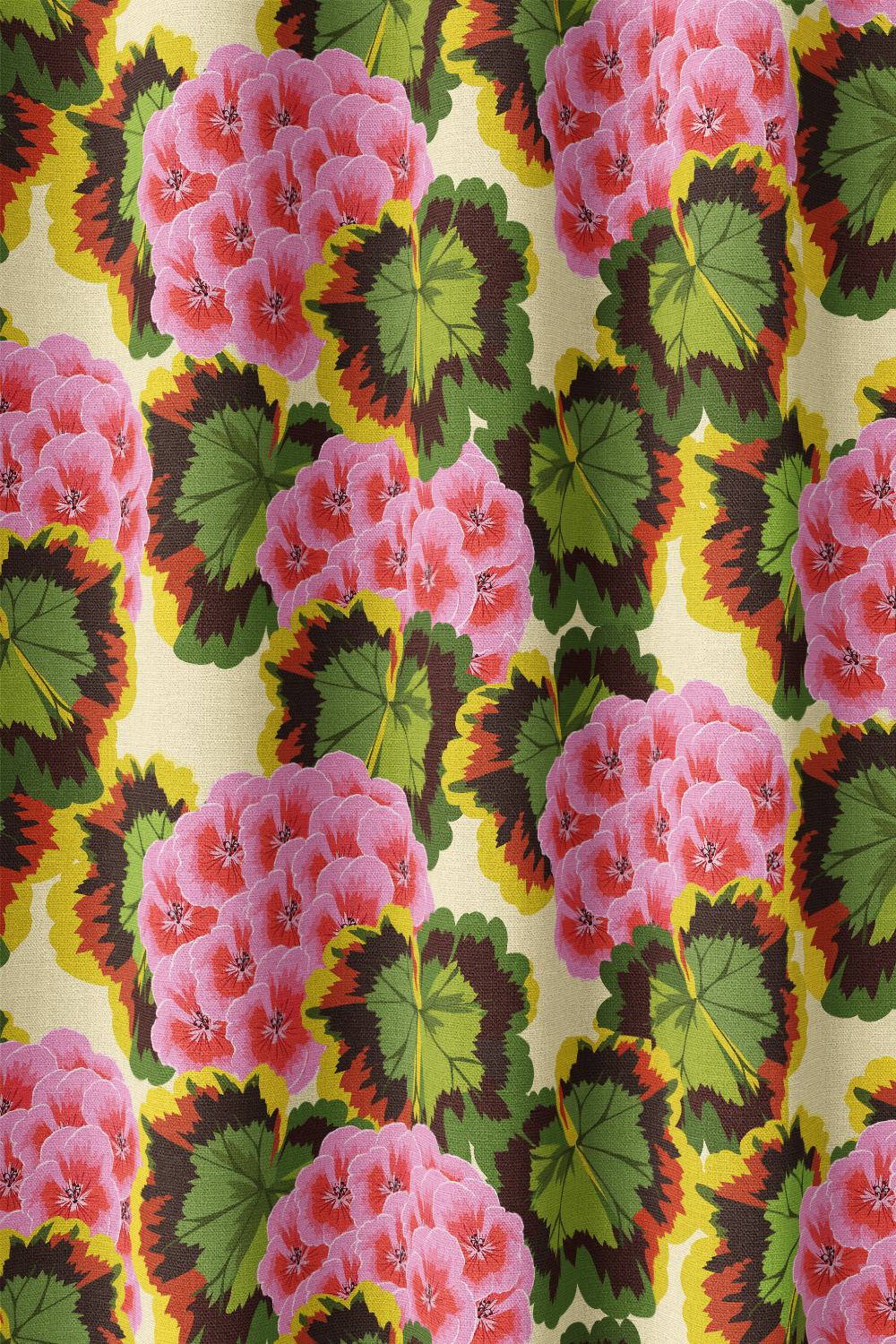 Lou's favourite flower, the pelargonium, in a beautiful hot pink. This stunning pattern is available as recycled velvet (used to upholster the stool in the images) or linen (curtain image).